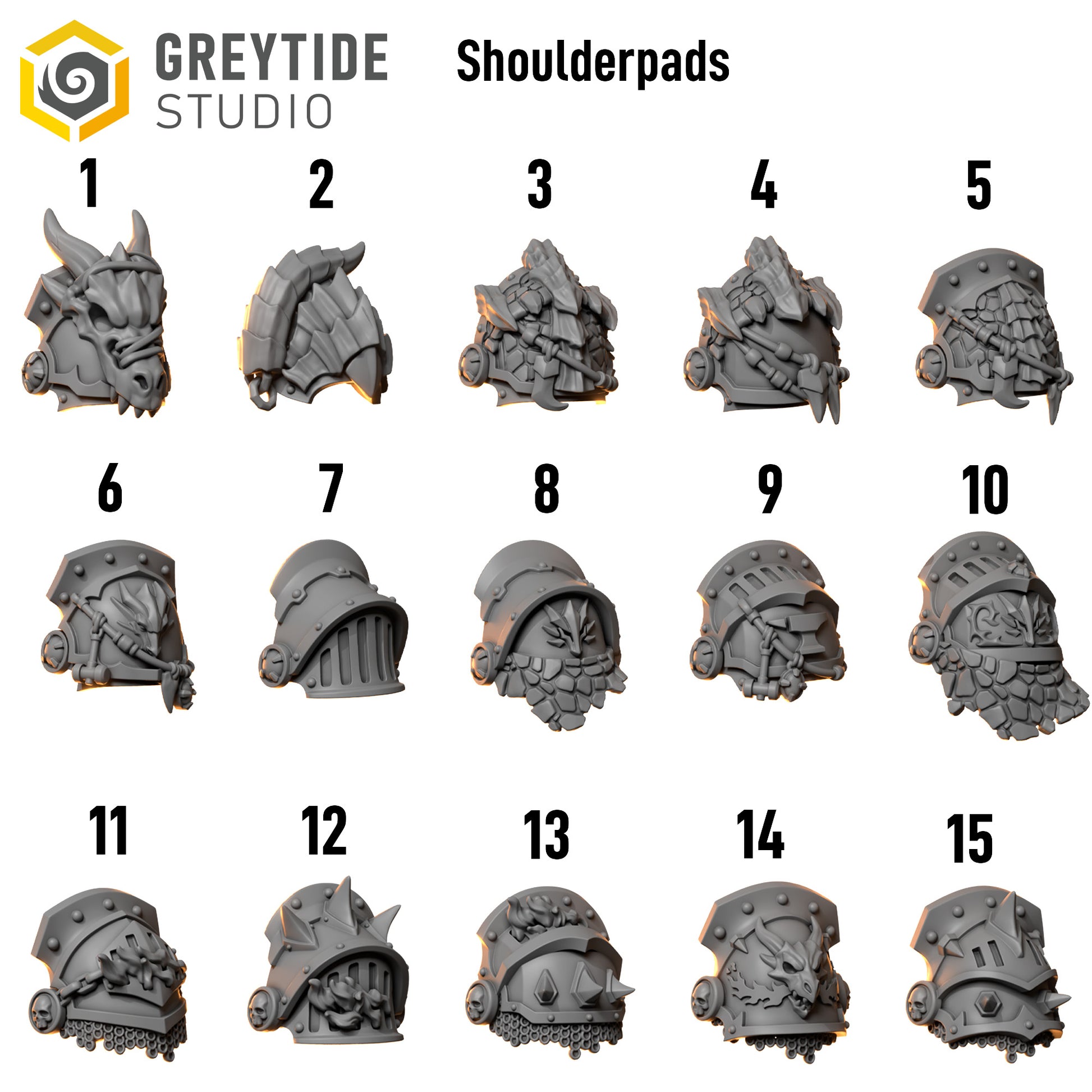 Elevate your Space Marine army with these high-detail Anvil Wardens shoulder pads from Grey Tide Studio. Each of the 15 designs features intricate, layered power armor, incorporating elements like dragon heads, skulls, chains, and ornate plating. Ideal for chapters such as the Black Templars, Dark Angels, or Grey Knights, these conversion bits are designed to add a venerable crusader feel to your heavily armored infantry, hero models, or even Dreadnoughts, ensuring your miniatures stand out on the battlefield.