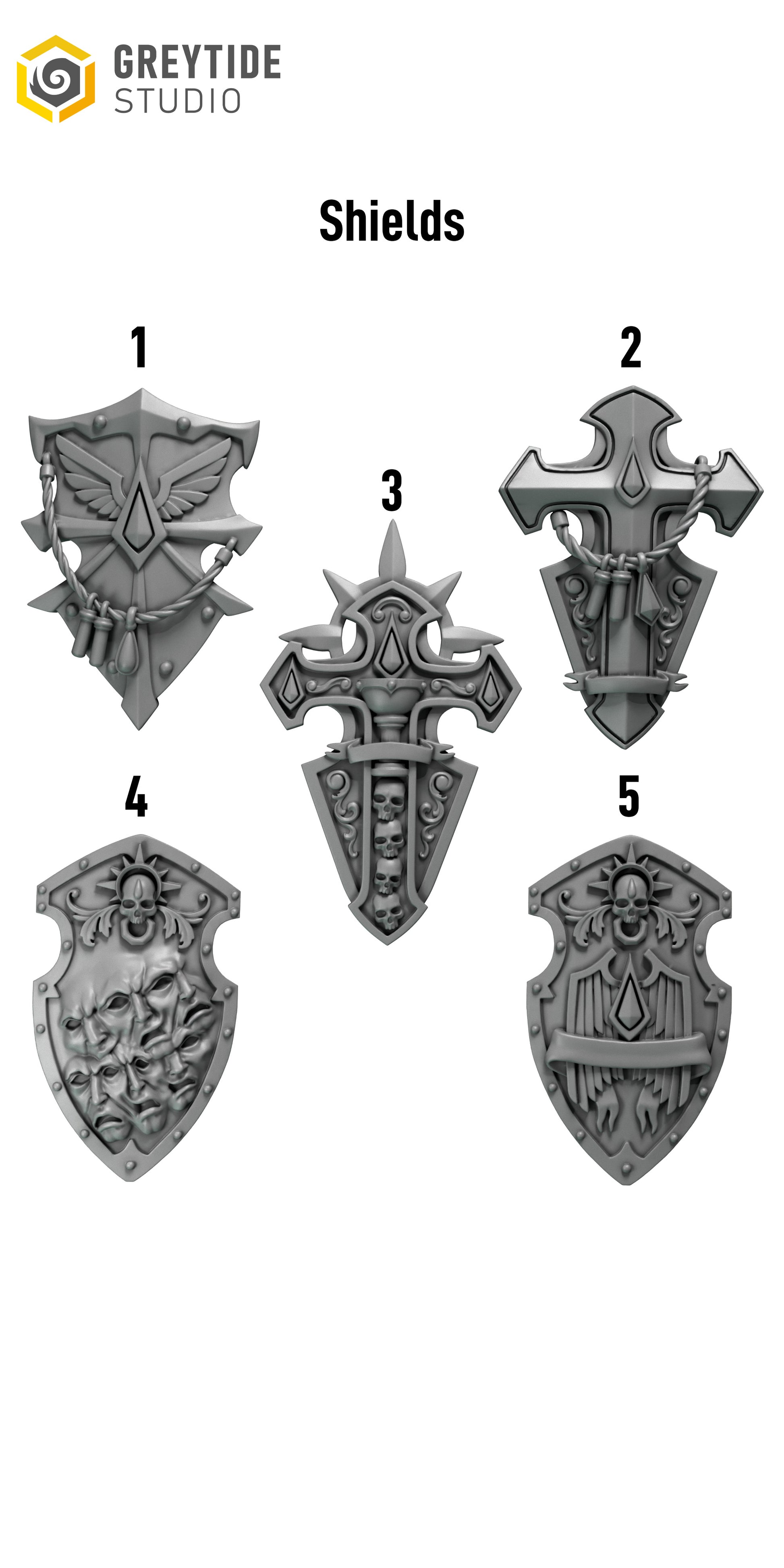 Elevate your Space Marine forces with these exquisite Anvil Wardens style shields from Grey Tide Studio. Each shield is a masterclass in Gothic and knightly artificer design, featuring ornate details perfect for venerable crusader-themed armies. Whether you prefer the rugged '1' with its studded surface, the fierce dragon motif of '2', the brutal mace-adorned '3', the dynamic flames and chains of '4', or the regal wolf/lion head of '5', these resin conversion bits offer unparalleled customization. Ideal for chapters like the Black Templars, Dark Angels, or Grey Knights, these shields are designed to integrate seamlessly with your existing models, providing a unique and imposing aesthetic.
