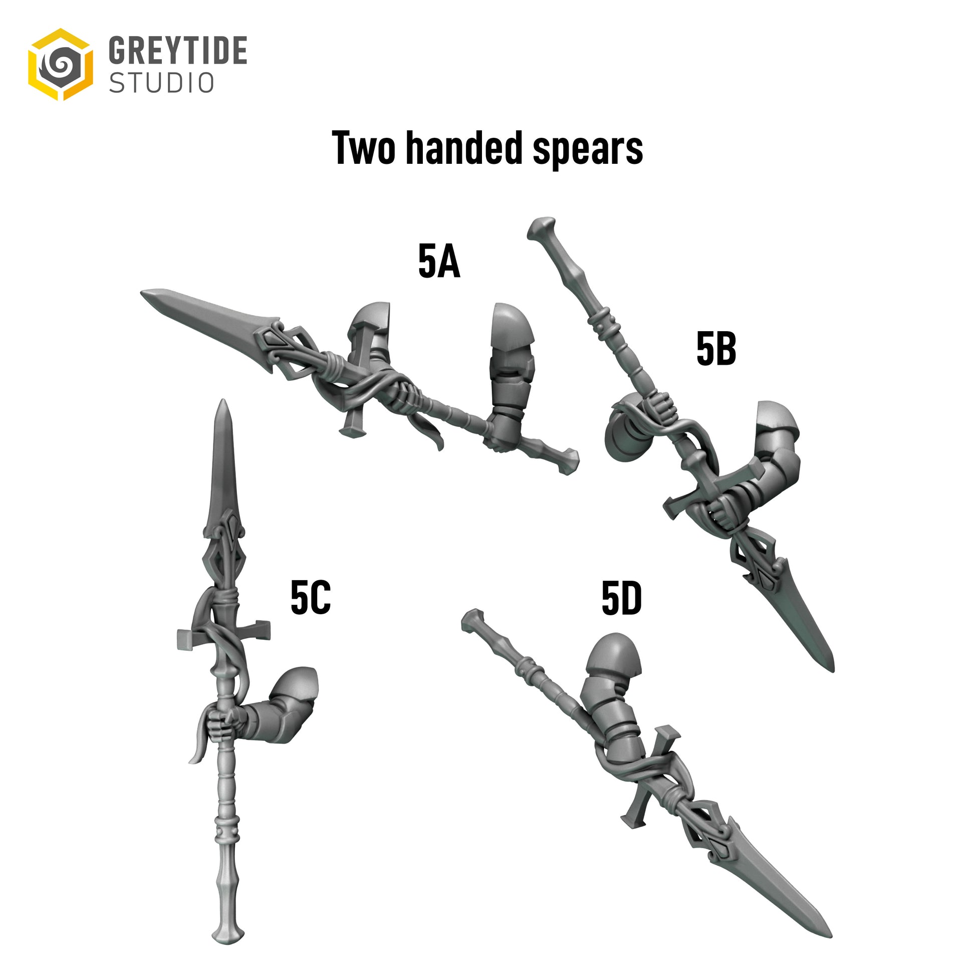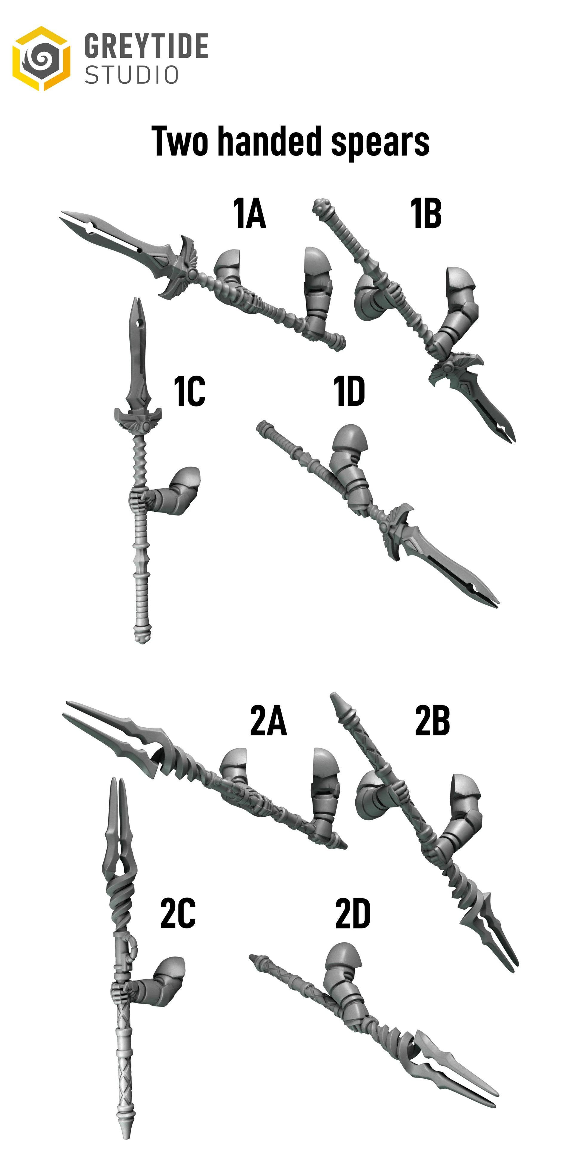 Elevate your elite Space Marine forces with these exquisitely detailed two-handed spears from the 'Crimson Lords' collection. Each resin conversion bit embodies a high-gothic, vampiric knight aesthetic, featuring ornate, baroque designs with twisted shafts and sharp, stylized blades. These bits are ideal for proxying or enhancing your Blood Angels Space Marine chapter and their successors, adding a unique and imposing look to your 28-32mm wargaming miniatures. Crafted for precision, these individual bits allow you to select the exact style needed to complete your custom models.