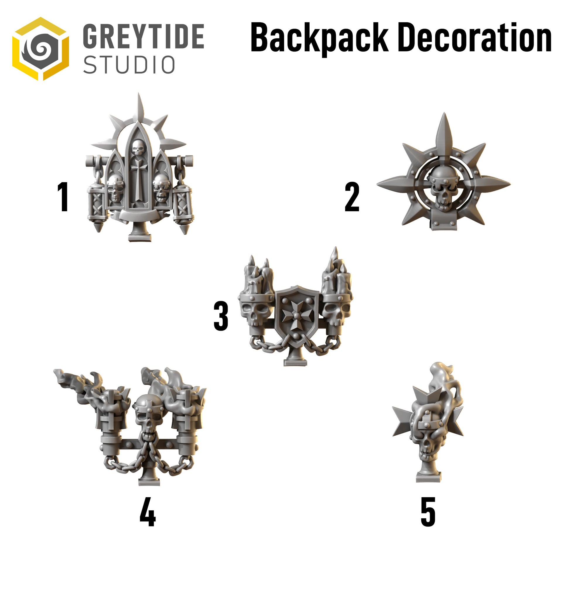 Elevate the look of your 28-32mm wargaming miniatures with these exquisite backpack decorations from the Eternal Crusaders collection. Each piece features the distinct Gothic and knightly crusader visual theme, incorporating zealous iconography, skulls, chains, and ornate details. These high-quality resin conversion bits are ideal for personalizing Terminator and Gravis-armored units, making them a perfect thematic match for Black Templars or any Imperium force seeking to project an aura of grim devotion.