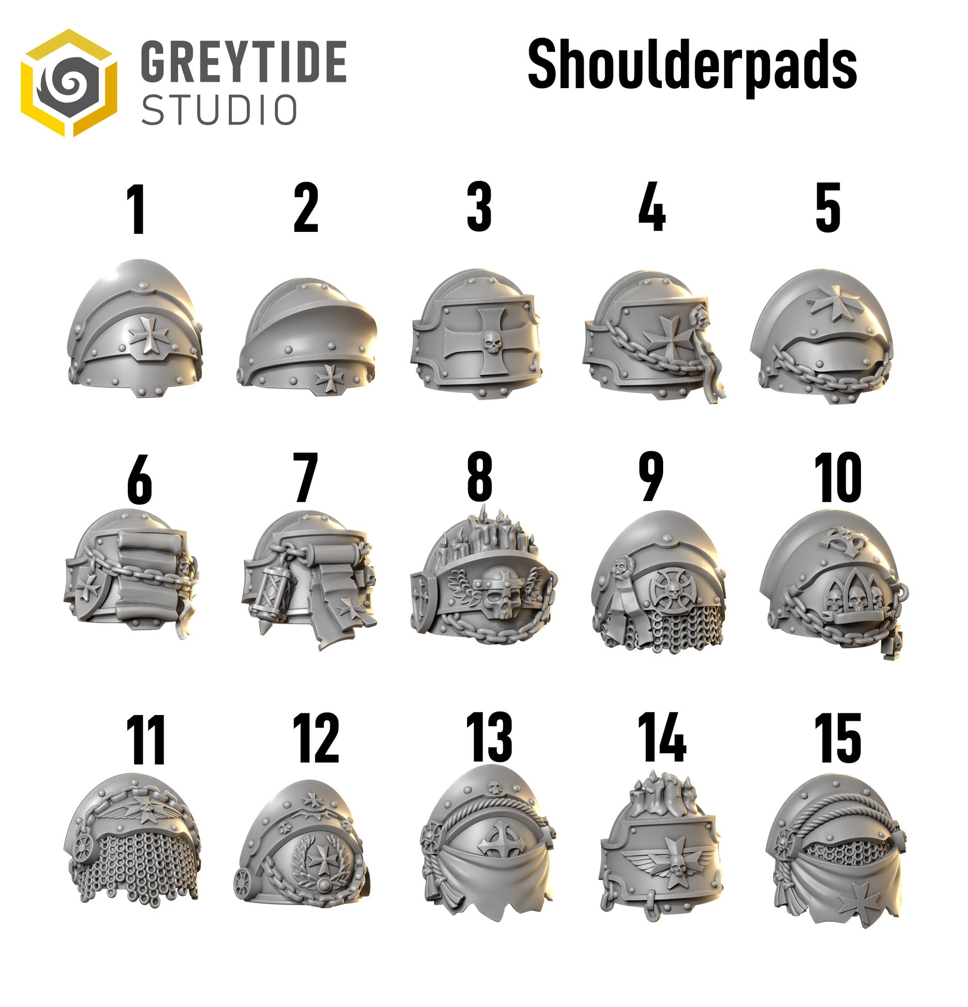 Elevate your Space Marine army with these high-detail Anvil Wardens shoulder pads from Grey Tide Studio. Each of the 15 designs features intricate, layered power armor, incorporating elements like dragon heads, skulls, chains, and ornate plating. Ideal for chapters such as the Black Templars, Dark Angels, or Grey Knights, these conversion bits are designed to add a venerable crusader feel to your heavily armored infantry, hero models, or even Dreadnoughts, ensuring your miniatures stand out on the battlefield.