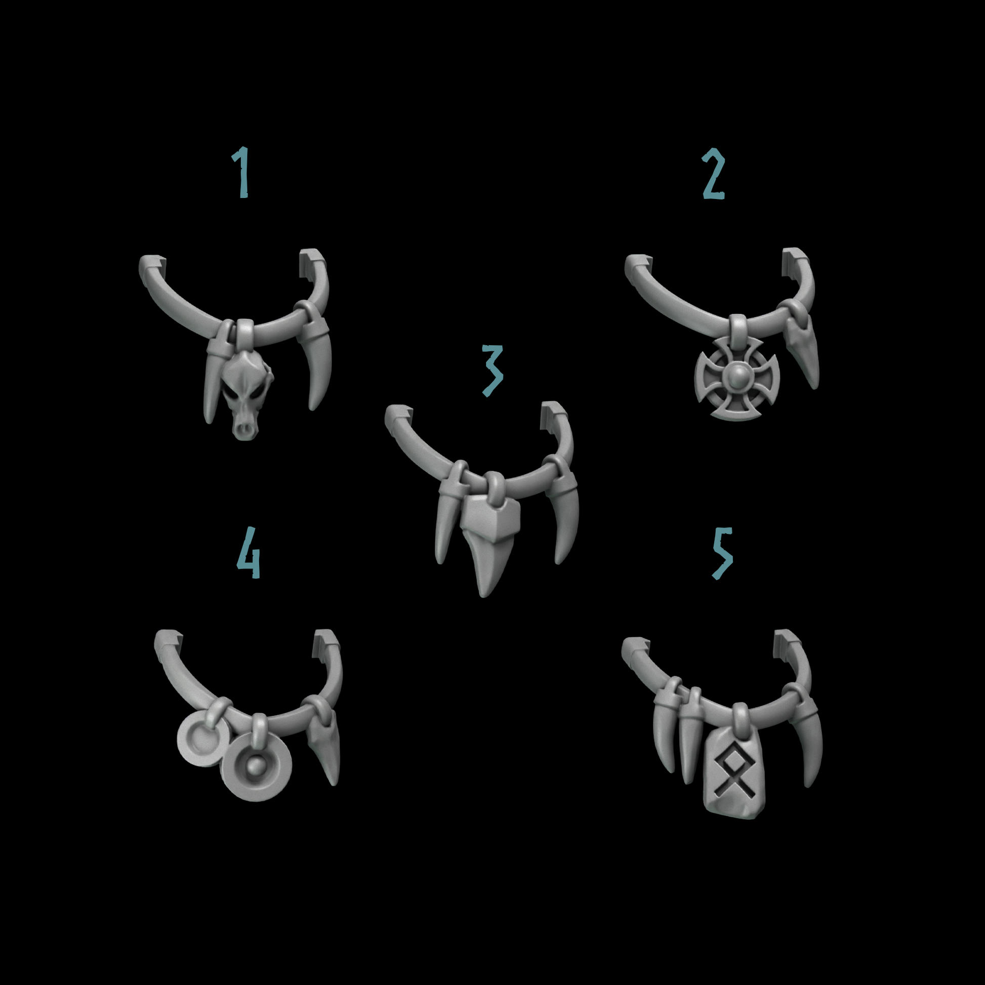 Enhance your Space Marine miniatures with these intricately designed resin necklaces, drawing inspiration from the fierce Primal Hounds collection. Each piece features distinct elements such as a wolf skull, ancient runes, sharp teeth, and tribal medallions, ideal for adding a feral, Viking aesthetic to your Space Wolves or other themed armies. These high-quality conversion bits are perfect for personalizing characters, sergeants, or entire units, ensuring your models stand out on the battlefield.