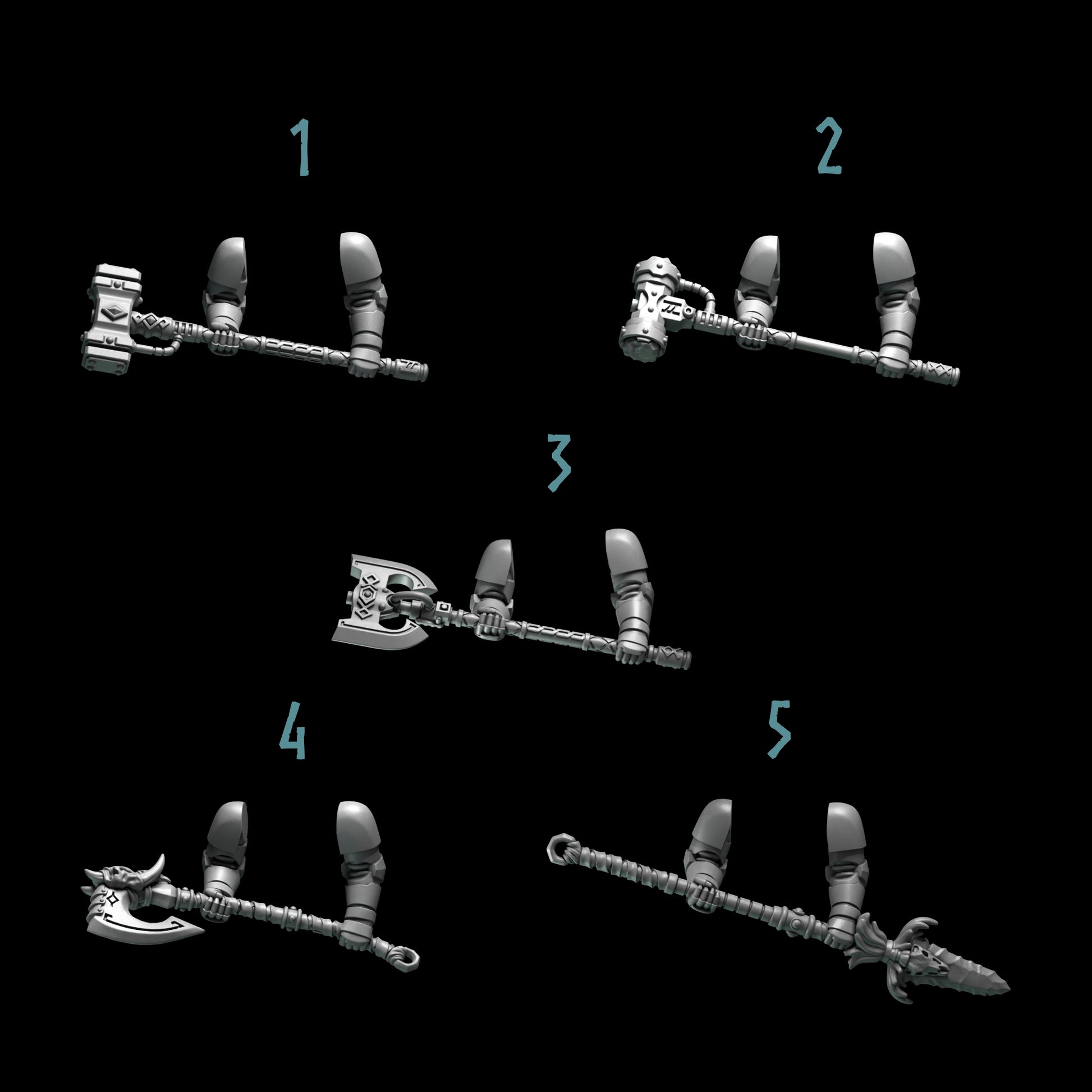 Elevate your 28-32mm wargaming miniatures with these high-quality resin conversion bits from the 'Primal Hounds' collection. Each two-handed weapon is meticulously designed with a strong Norse/Viking influence, featuring intricate runes, wolf motifs, and robust construction. Options include two distinct power hammers, two formidable axes (one with a horned wolf-skull design), and an ornate spear, all crafted to perfectly complement your Space Wolves or other feral Space Marine chapters, adding unparalleled character and ferocity to your heavy-armoured units like Terminators or Aggressors.