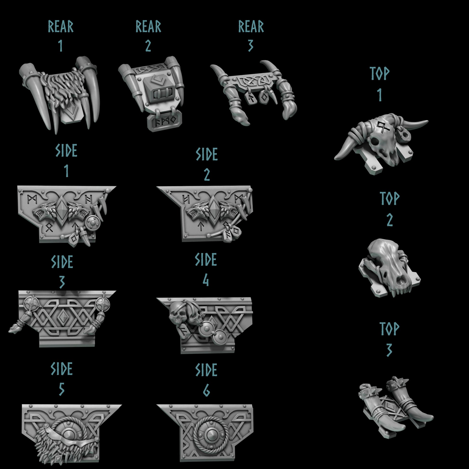 Imbue your Warhammer 40k Space Marine Dreadnoughts, vehicles, or other large models with the fierce spirit of the Primal Hounds. This collection of resin conversion bits features a range of substantial decorative elements, each meticulously sculpted with a distinct Norse and Viking aesthetic. Choose from various armor plates adorned with intricate Celtic knots, wolf iconography, ancient runes, and feral trophies like pelts, skulls, and horns. These high-quality resin pieces are perfect for customizing your Space Wolves proxies, adding unparalleled character and a unique, battle-hardened look to your army.